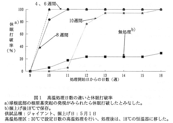 イキシア球根の休眠は30℃の高温に4週間以上遭遇すると打破される(図1)。