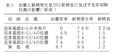 - 花芽の基部から1/4の部分で切り取ると新梢は出てくるが花蕾は除かれてほとんど出てこないのに対し、1/2の部分で切り取ると40%近くの芽に花蕾が残る。花芽を基部からかき取っても、花芽着生部の脇から新梢が発生する(表1)。