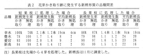 - 花芽かき取り跡の新梢発生率は、供試したどの品種も70%以上であり、実用上問題はない。花芽かき取り跡に発生する新梢の長さは、短果枝ではどの品種も無処理よりも長く、長果枝では、幸水は無処理よりも劣るが他の品種では無処理と大差はない(表2)