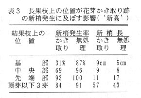 - 花芽かき取り跡の新梢発生率は、長果枝の基部では無処理よりかなり低い。中央部から先端部にかけては無処理よりやや劣るが、実用上問題はない(表3)