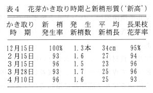 - 花芽をかき取ると花は咲かないが、かき取り跡に新梢が1~2本発生し摘蕾とほぼ同等の効果をもたらす、この処理は、省力化、かつ、12月中旬から発芽期までの広い機関内に行うこでき、労力分散が図れる。