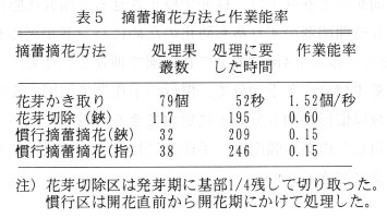 - 出蕾後に行う従来の方法とかき取りの作業能率を比較すると、かき取りの方が10培程度能率が高い(表5)。