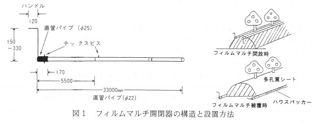 - マルチ資材は、フィルムが互いに接着しにくい多孔質シートが適している。それをまず畝中央で専用テープにより接着した後、地面から15cm離して幹に固定する。さらに、その両端をマルチ開閉器に重ねてハウスパッカーで圧着する。このとき、マルチ被覆状態になる(図1)。なお、耐風性を高めるために、畝の両端は肥料袋等で被覆する。一方、畝面の下から上に向かって巻き上げ、株元で停止させると開放状態になる(図1)。なお、巻き上げたマルチ開閉器のずり落ち防止のためにハンドル止めを設ける。
