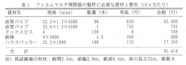 - マルチ開閉器は、ハンドルと数本の直管パイプを連結した構造で(図1)、製作に必要な資材費は、10a当たり約9万円である(表1)。直管パイプの耐用年数は、約10年である。