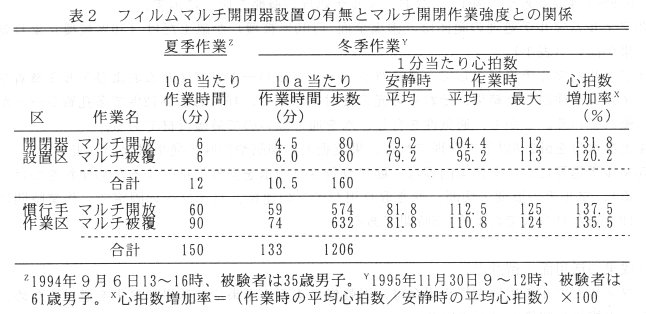 - 畝間3.5m、畝幅2m、畝高0.4mの畝立て栽培園で調査した結果、10a当たりのマルチ開閉所要時間は、夏季12分、冬季10分で、慣行の手作業で開閉する場合の約12分の1に短縮でき、所要歩数は慣行の約8分の1に短縮できる(表2)。