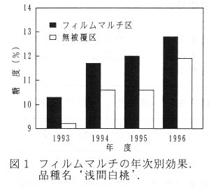 - モモの果実糖度を高めるフィルムマルチの効果は、4カ年間とも認められ、その範囲は0.9~1.4%である(図1)。なお、マルチ処理の概略を図2に示す。