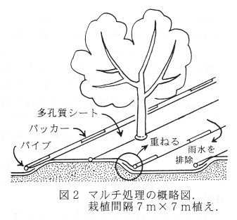 - マルチ処理にかかる作業内容は、稲ワラ敷き(雨水を園外に排除するため傾斜をつける)、マルチの展開・切断、巻き取り用パイプの連結、パイプへの固定で、作業時間は10a当たり2人でおよそ7.5時間である。