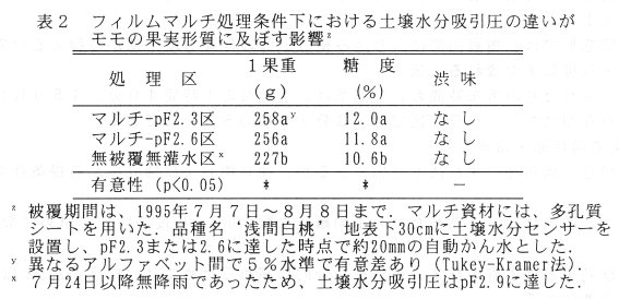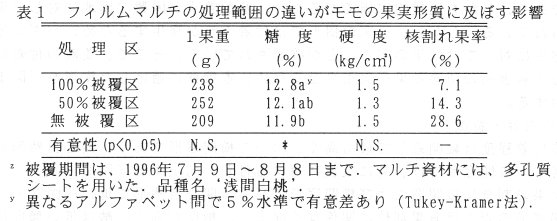 - 消費者の果物に対する嗜好の高級化・多様化に伴い、品質の悪い果実は売れにくくなっている。とくに、モモでは、収穫前1カ月間の不良天候が果実糖度を著しく低下させるため、気象の変動に左右されることなく、高品質な果実を安定して生産する技術の開発が強く望まれている。そこで、高品質果実を安定して生産する手段として、フィルムマルチによる光環境の改善と土壌水分の制御を検討する。