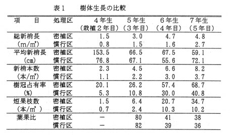 - 密植区の㎡当たり総新梢長は慣行区より長く、樹冠占有率はいずれの年も密植区が高く、成園化が早い。㎡当たりの短果枝数はいずれの年も密植区の方が多い(表1)。密植区の側枝長(2年生以上の部分)は、栽植5年目で1.5m以下であり、樹間内に抑えられる(デ-タ略)。