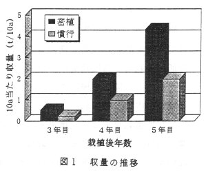 - 10a当たりの収量は、いずれの年も密植区が慣行区より2倍以上である。慣行区は栽植5年目で1.98t/10aであるのに対し、密植区は4.33t/10aとなり、成園並み収量が得られる(図1)。