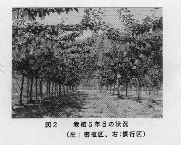 - 密植区の果重は慣行区よりやや小さく、果汁のBrixも密植区でやや低いが、果色、果肉硬度や果汁のpHは両区とも同程度である(表2)。