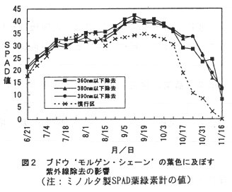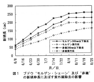 - モルゲン・シェーン’及び‘赤嶺’ともに紫外線除去(以下UVカット)フィルム下での栽培により新梢の生育が旺盛になる(図1)。また、紫外線を除去して栽培することにより乾物生産量も増加する傾向がある。