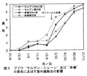 - ブドウ‘モルゲン・シェーン’及び‘赤嶺’は、紫外線を除去して栽培することにより、葉の老化の遅延と果実の日持ち性の向上を図ることができる。また、紫外線除去フィルムの被覆時期・期間を変えることにより着色-収穫時期の調節ができる。