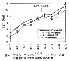 - 紫外線を除去すると、葉が遅くまで健全に保たれるため、糖度がやや高くなる(図4)。