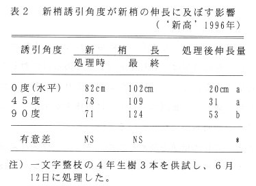 - 角度を変えて誘引すると、ほぼ誘引角度に反比例して伸長が抑制される(表2)。
