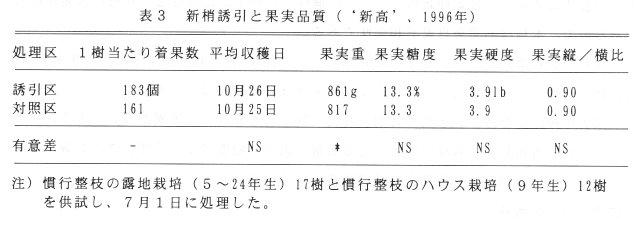 - 満開後70日目ごろに盛んに伸長している新梢を水平に近く誘引すると果実肥大が促進される(表3)。