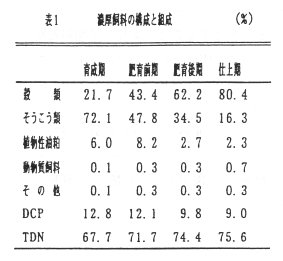 - 黒毛和種去勢牛を用い、自家配合した飼料で、肥育期を4期にわけて、DCP、TDNを調整して、生後26カ月齢(以下、Ⅰ区)、28カ月齢(以下、Ⅱ区)、仕上げの肥育成績を比較した。(表1)