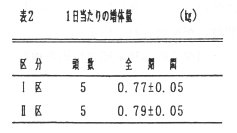 - Ⅰ・Ⅱ区とも増体は良かったが、Ⅱ区がⅠ区よりやや優れていた。(表2)