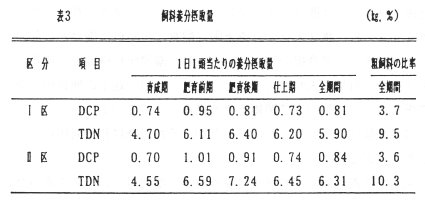 - 飼料のDCP摂取量はⅡ区で、前期、後期で多かった。TDN摂取量もDCPと同様の傾向であった。粗飼料の比率もⅡ区が、全期間を通じて多かった。(表3)
