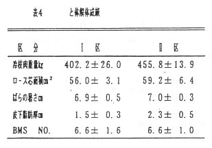 - 冷と体重量はⅡ区が、455.8㎏と28カ月齢出荷でも十分な枝肉重量が得られた。また、ばらも厚く、ロース芯面積も両区とも大きかった。(表4)