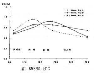 - BMSNO.が高いほど肥育前期の増体は緩やかで、生後16カ月齢から20カ月齢に上昇し以後、緩やかに下降させる発育パターンが明らかになった。(図1)