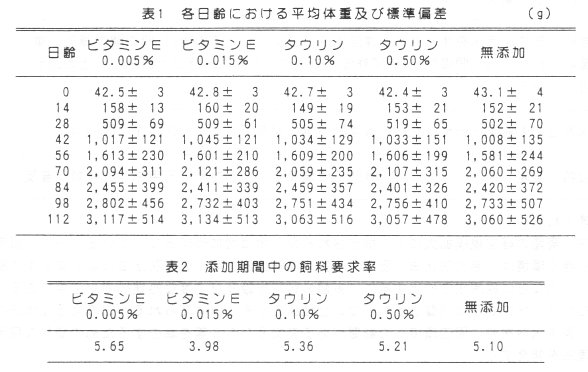- 添加期間中の増体量はビタミンEを0.015%添加したものがやや多く、飼料要求率が他区より優れていた(表1、2)。