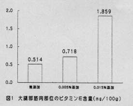 - 筋肉中のビタミンE含量(100g当たり)は、添加量に比例して多くなり、無添加区及び0.005%添加区と0.015%添加区との間に有意差が認められた(図1)。