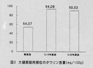 - 筋肉中のタウリン含量は、添加量に伴った含量の増加はみられなかったが、無添加区と各添加区との間に有意差が認められた(図2)。