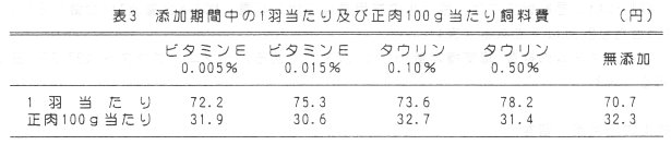 - 添加期間中の1羽あたり飼料費は、同添加物間では、添加量が多いものの飼料費が多く、無添加区との差は1.5円から7.5円であったが、正肉100g当たりの飼料費は無添加区の正肉歩留まりがやや劣ったこともあり、むしろ無添加区より少なかった(表3)。