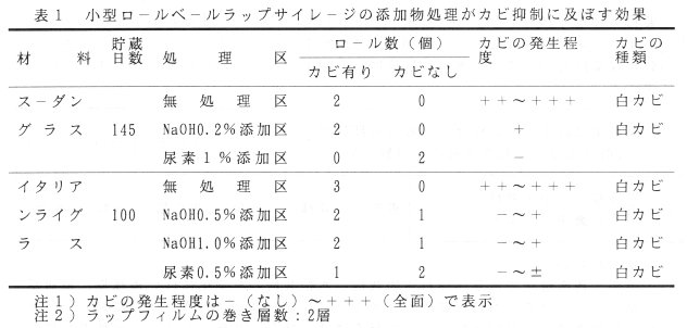 - 貯蔵日数100日のイタリアンライグラスサイレ-ジの無処理区では、3梱包とも白カビが広範囲に発生し、水酸化ナトリウム0.5%添加区および1.0%添加区でも3梱包中2梱包に白カビが部分的に発生したが、他の1梱包にはカビが認められず、一方、尿素0.5%添加区では1梱包に白カビがごく一部に発生したが、他の2梱包にはカビの発生が認められなかった(表1)。