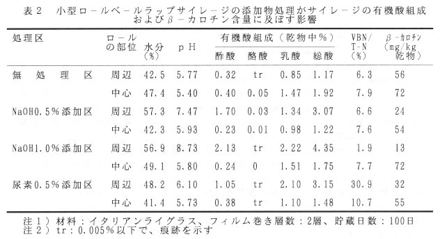 - 水酸化ナトリウムおよび尿素の添加処理は、サイレ-ジの発酵品質には悪影響を及ぼさなかった。ただ、これらのアルカリ添加物処理区では無処理区に比較して、ロ-ルの周辺部においてβ-カロチンの含量が少なくなる傾向が認められた(表2)。