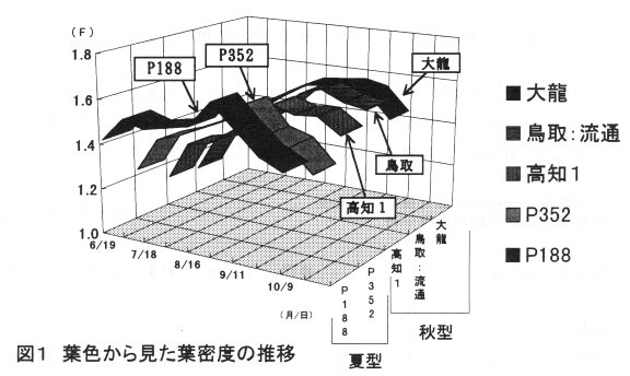 - F値の推移は系統により違いがみられ、F値の調査日毎の推移を主成分分析した結果、夏期にF値が高くなりその後低くなるP188とP352のグループ〔夏型〕と、夏期から秋期にかけてF値が高くなり、その後緩やかに低下していく高知1、鳥取および大龍のグループ〔秋型〕などに分類される(図1)。