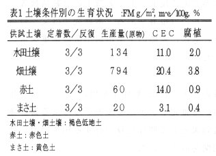 - 土壌条件別のシバの生育状況の違いを調査した結果、どの土壌においても定着したが、1cmの高さで刈り取った原物量は、畑土が最も多かった(表1)。