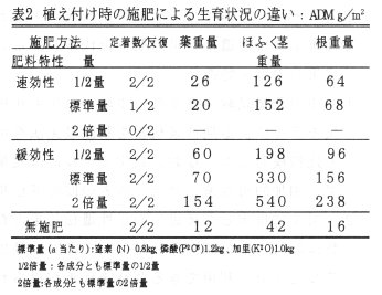 - 植え付け時の施肥量および肥料の種類の検討では、緩効性の肥料を使用した場合の定着率は施肥量にかかわらず全て定着したのに対し、速効性の肥料を使用した場合は定着が悪くなり、特に標準の2倍量を施肥した場合は定着しなかった(表2)。