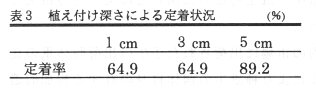 - 植え付け時の深さによる定着率の違いを調査した結果、植付けから100日目の定着率は、1cmと3cmに比べ、5cmで高い(表3)。