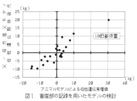 - 図1に推定した種雄牛の母性遺伝効果の育種価と期待後代差の関係を示した。相関係数は0.90、順位相関係数は0.84であり、種雄牛の遺伝的能力に関しては父-母方祖父モデルで十分に利用できる期待後代差が得られた。