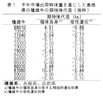 - 1992年11月から1995年9月の間に島根県内の市場に出荷された子牛の出荷時体重の記録から15,694件を用いて父-母方祖父モデルにより種雄牛の個体自身の有する相加的遺伝効果と母性遺伝効果の期待後代差を推定した。
