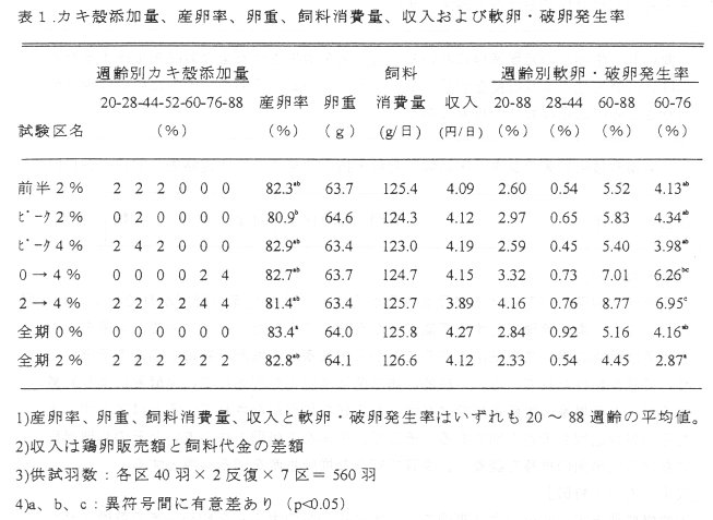 - 20~88週齢の軟卵・破卵発生率は60週齢以降カキ殻を増量した区(0→4%区と2→4%区)がやや高く、他の区は3%以下で低かったが有意な差ではなかった。特に60~76週齢では区間に有意差が認められた(表1)。