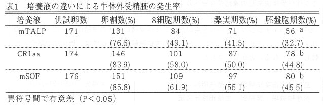 - 単純組成培養液で牛体外受精由来胚を培養した結果、mTALP 32.7%(56/171)、CR1aa 44.8%(78/174)、mSOF 45.5%(80/176)の割合で胚盤胞期まで発生し、CR1aaとmSOFで有意に高い(表1)。