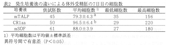 - 牛体外受精由来胚の培養7日目の胚盤胞期胚の細胞数について比較したところ、それぞれの培地で、mTALP 79.3±4.3、CR1aa 96.5±6.4、mSOF 88.0 ±3.9となり、CR1aa 及びmSOFはmTALPに比べ細胞数が多い(表2)。