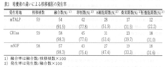 - 核移植胚で同様の試験を行った結果、胚盤胞期への発生率は、mTALP 22.2%(12/59)、CR1aa 31.0%(18/59)、mSOF 31.6%(18/58)となり牛体外受精由来胚の結果と同様である(表3)。