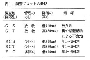 - 島根県三瓶山地域の、1ha当たり1頭程度の和牛放牧が行なわれている草地(放牧区、シバ優占)、レクリェーション利用のために年4~5回の頻繁な刈取り(多回刈区、シバ優占)または年1~2回の刈取り(少回刈区、トダシバ優占)が加えられている草地において(表1)、植生高の異なる群落ごとに植物社会学的な調査を行ない、種組成や群落構造を比較した。