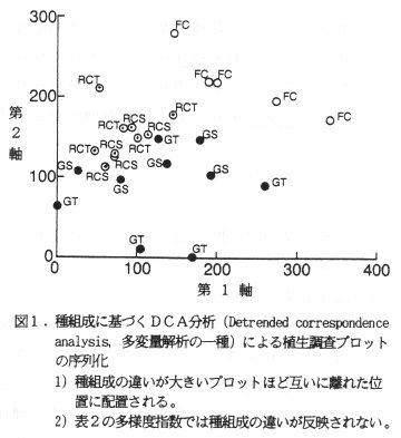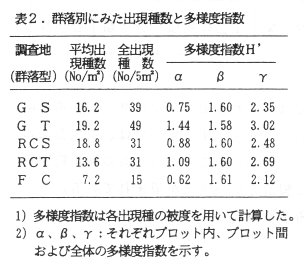 - 群落別にみた出現種数と多様度指数(表2)からみると、放牧区では、丈の高いパッチ(不食地)での出現種数や多様度指数が丈の低い場所に比較して高い。少回刈区では丈の低い場所と丈の高いパッチとの間の出現種数や多様度指数に大きな差はみられない。一方、多回刈区が他の2区に比べて著しく低いのが特徴的である。