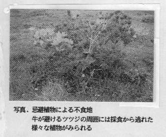 - 種組成に基づいて植生調査プロットを序列化した結果、放牧地ではプロット間の種組成の違いが少回刈区、多回刈区に比較して大きい(図1)。これは有刺植物、不食植物あるいは糞の周囲に生じる不食過繁地が、種組成や群落構造の面で被食地と大きく異なるためである(写真)。