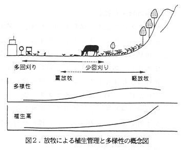 - 以上より、多様性の保全を目標にする場合、不食地がパッチ状に残るような比較的ゆるやかな放牧強度(1ha当たり1頭以下)による植生管理が有効な手段となり得る(図2)。
