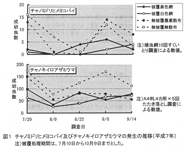 - 夏から秋にかけての生育期に全面被覆することにより、チャノミドリヒメヨコバイ、チャノキイロアザミウマの成幼虫密度は低下し、被害は減少する(図1)。