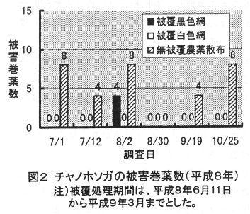 - 玉露、てん茶の覆い下栽培に普及している固定の被覆棚の遊休期間を活用して農薬散布回数の減少を図るため、遮光度の低い目合1㎜以下の化学繊維製の網を全面被覆し、茶樹の主要害虫の発生消長と生育、収量への影響を検討した。