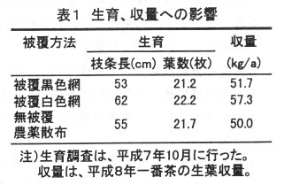 - 白色網の全面被覆は、生育及び一番茶収量も良好である(表1)。