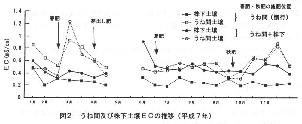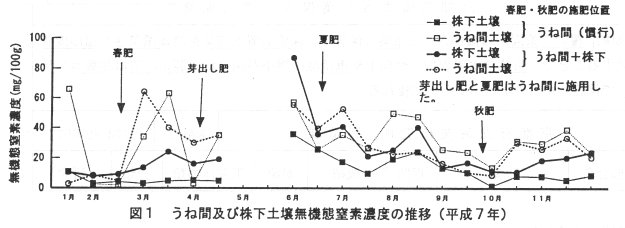 - 土壌無機態窒素濃度は、株下部では施肥量の多いうね間に比較して低い傾向がある。また、株下施肥により、慣行施肥のうね間に比べ、株下部は比較的安定した濃度で推移し、うね間の部分は秋期には慣行施肥と同程度に維持される(図1)。
