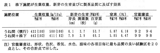 - 株下施用が生葉収量に及ぼす効果は、1年目(平成7年)では差が認められないが、2年目(平成8年)では減収となる。しかし、一番茶新芽の生育は、芽長は長く、百芽重は重くなる。また、製茶品質は株下施肥の方が良好で、荒茶中の全窒素含有率も高くなる(表1)。